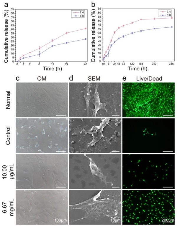 通过透析法测定双氯芬酸释放曲线,结合细胞共培养实验,研究DM的释药特性及对成骨细胞的保护效果,结果表明pH7.4时14天释放53.68%,高浓度双氯芬酸可使成骨细胞维持正常形态,存活率显著提升。