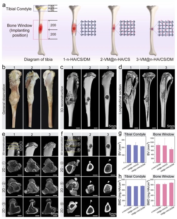通过Micro-CT扫描胫骨样本,定量分析骨体积和骨密度,研究不同支架的骨再生效果,结果表明VM@n-HA/CS/DM组骨密度达878.15mg HA/cm³,虽骨体积较低但结构更致密,修复效果最佳。