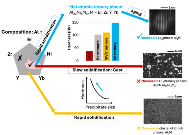 图1. 合金设计概念图 (论文Figure 1,展示三种不同凝固路径与最终硬度对比)清晰揭示设计精髓:借助快速凝固形成亚稳三元相(蓝色路径),最终得到纳米级析出相和最高硬度。