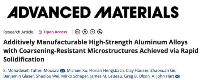最近,一项来自麻省理工学院等研究团队、发表于Advanced Materials的研究带来了新思路。研究团队通过一套创新的 “计算-实验”混合流程,成功设计并制备出一种名为Al-0.4Er-1Zr-1.33Ni 的新型合金。研究团队制备了合金粉末并通过增材制造制成无裂纹的宏观试样,其强度是同类铸造合金的五倍,与锻造Al 7075相当。并且研究团队指出“在400°C度高温环境下时效 48小时后,该合金的强度没有明显下降。” 本期谷·专栏将简要分享这一研究成果。
