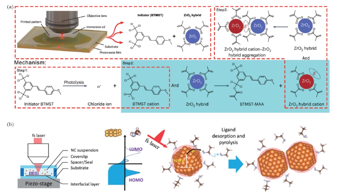 3.光诱导纳米颗粒配体脱附胶体纳米颗粒通常由功能核心以及表面配体组成,其在溶液中稳定分散的能力往往由表面配体所决定,如果表面配体脱附,纳米颗粒核心在溶液中无法维持分散状态,容易形成团簇失稳,从而形成沉淀。研究人员通过光诱导ZrO2纳米颗粒表面配体脱附形成带电颗粒,如图3(a)所示,以2,4-双(三氯甲基)-6-对甲氧基苯乙烯基-S-三嗪(BTMST)为光引发剂与甲基丙烯酸配体修饰的ZrO2纳米颗粒形成ZrO2-BTMST杂化物。在光辐照下,BTMST光解并与ZrO2纳米颗粒表面配体相互作用,破坏了颗粒表面电荷屏蔽层,ZrO2颗粒聚集后,溶解度降低,实现纳米结构打印。对于金属纳米颗粒而言,飞秒激光能直接实现表面油酸配体脱附热解,进而使纳米颗粒间定向组装,完成三维结构制造,如图3(b)。同样的,光诱导纳米颗粒表面配体脱附并非是一个通用性方法,具体机理会因纳米颗粒以及表面配体种类性质变化而变化,使其难以满足于具有丰富种类的胶体纳米颗粒库。