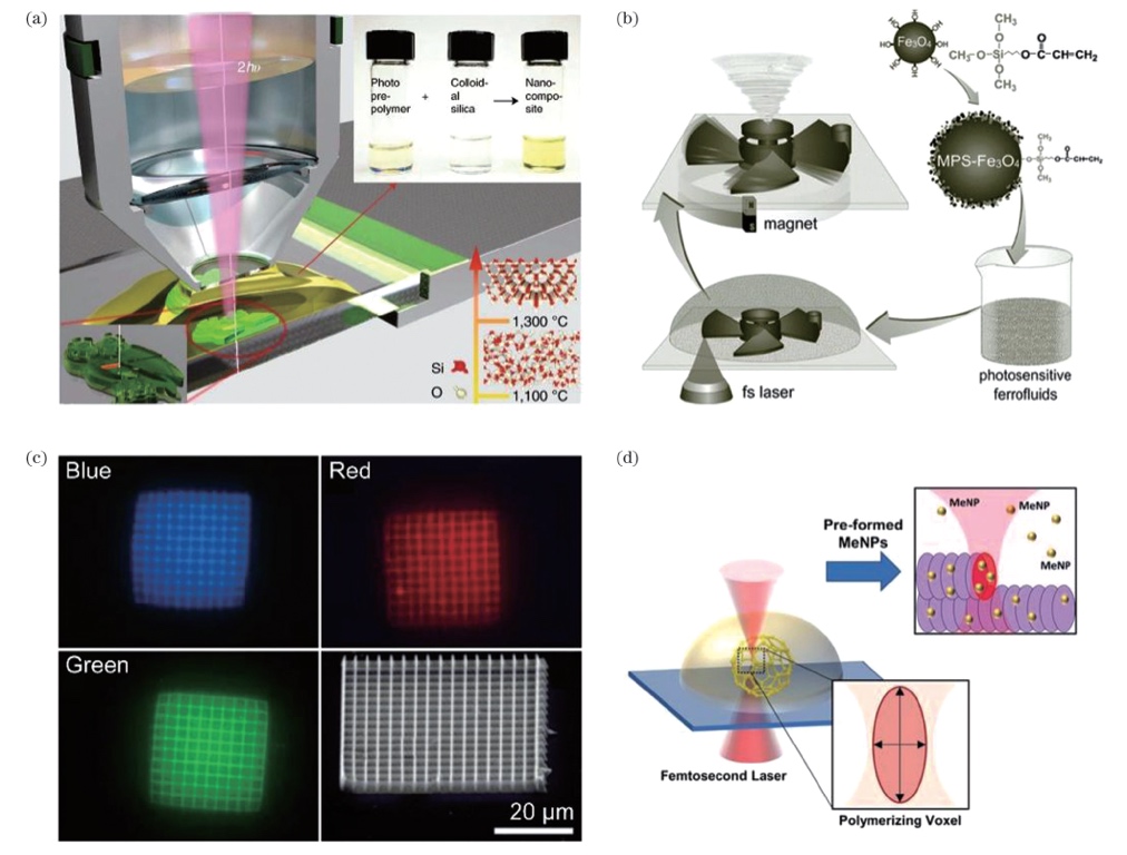 图1 基于纳米颗粒共混的双光子聚合打印方法。(a)二氧化硅纳米颗粒树脂双光子聚合打印;(b)磁性 Fe3O4纳米颗粒双光子聚合打印;(c)含红绿蓝量子点双光子聚合打印;(d)金属纳米颗粒双光子聚合打印