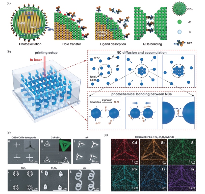 4.光诱导纳米颗粒配体成键通过激光诱导纳米颗粒间化学键合,能提升颗粒间的结合力,为纳米颗粒三维结构制备提供较强的机械支撑作用。2022年,清华大学精密仪器系孙洪波、林琳涵课题组首次提出光激发诱导化学键合技术,这项技术利用光生载流子调控纳米颗粒表面配体活性,实现了半导体、金属胶体纳米颗粒间的化学键合及3D纳米打印。具体过程以量子点为例:光激发量子点后产生激子,激子分离形成的空穴通过能级适配转移到纳米晶体表面,诱导硫醇配体通过氧化还原反应脱附。配体脱附后,会在纳米晶表面暴露出未成键的活性位点,与相邻颗粒表面配体成键,从而实现纳米颗粒间成键、组装及打印。这表明在合适的颗粒-配体能级设计下,可以适用于多种纳米颗粒体系的三维微纳结构制备。如图4(a)所示。这项技术可以实现超越光学衍射极限的制造,其打印线宽最小可达77 nm。纳米像素画结构的显示分辨率能达到20000 ppi,展现出了在集成光电子及超分辨显示等方面的应用可能性。此外,该技术无需共混、烧结等复杂的前处理及后处理过程,能够维持纳米颗粒原有特性,有望用于制备高分辨QLED、集成光电探测器、太阳能电池等光电器件。