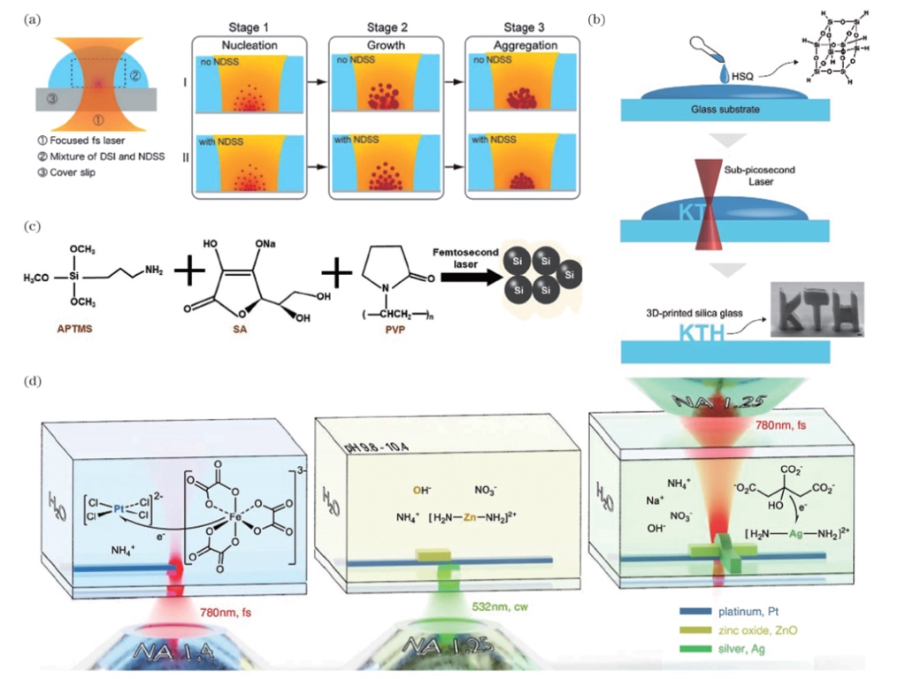 图2 基于前驱体反应的激光打印方法。(a)激光打印还原金属结构示意图,包括形核、生长、聚集三阶段;(b)基于氢倍半硅氧烷(HSQ)直写玻璃三维微纳结构;(c)基于硅烷偶联剂激光还原打印硅结构;(d)激光打印Pt、ZnO、Ag微纳结构