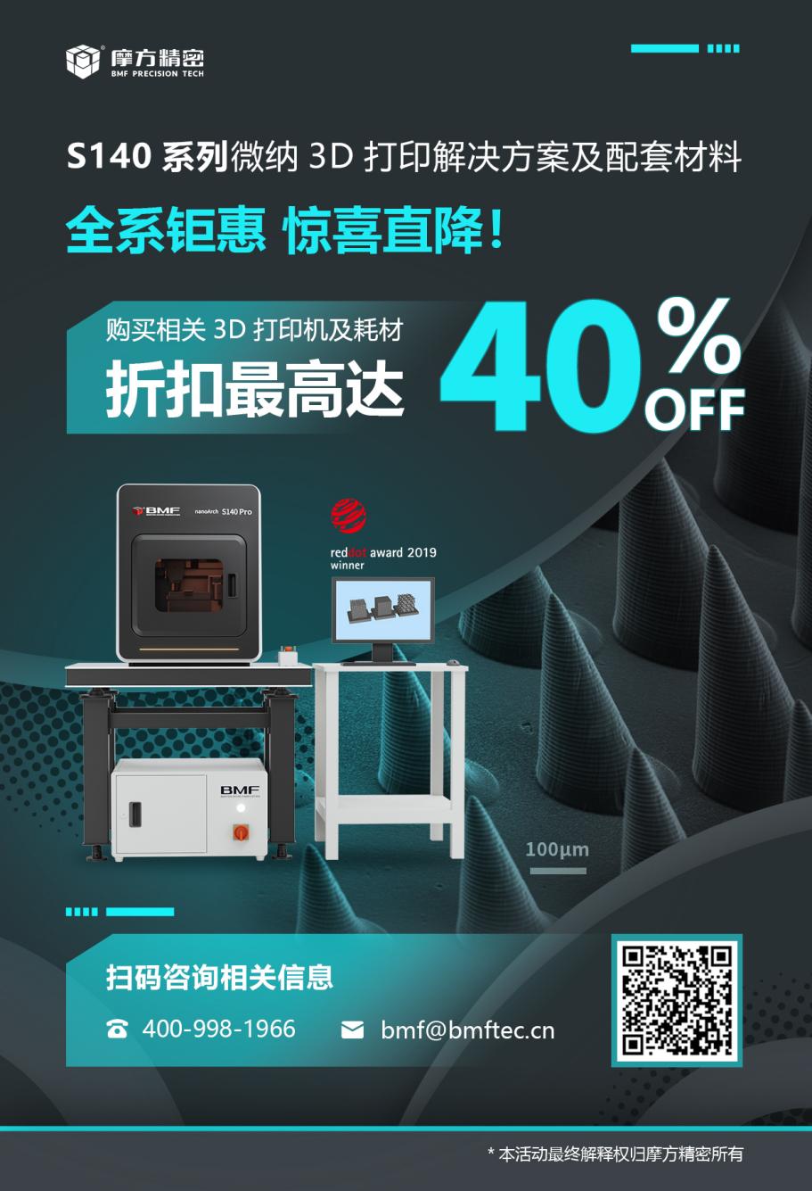 最近几年,微纳级3D打印的应用研究,逐渐在科研领域流行起来。摩方精密作为这个领域的龙头设备厂商,从第一代高精度3D打印系统发布以来,一直深耕微纳3D打印赛道,不断创新PμSL技术,升级设备制造,拓宽终端应用。现在是2024年年底,摩方放出大优惠活动,希望让更多研究人员参与到微纳级3D打印的科研活动中去,为广大高校及科研机构、生物医疗、制造业等企事业单位客户提供高质量低成本的微纳增材制造技术、设备和解决方案,能够帮助更多科研院校、生产制造、产品开发中的困难,打通模型设计到实验验证的重要环节,提升研发创新空间和实验优化效率,在推动增材制造技术普及与应用的同时,也加紧各领域产学研深度合作的发展步伐。