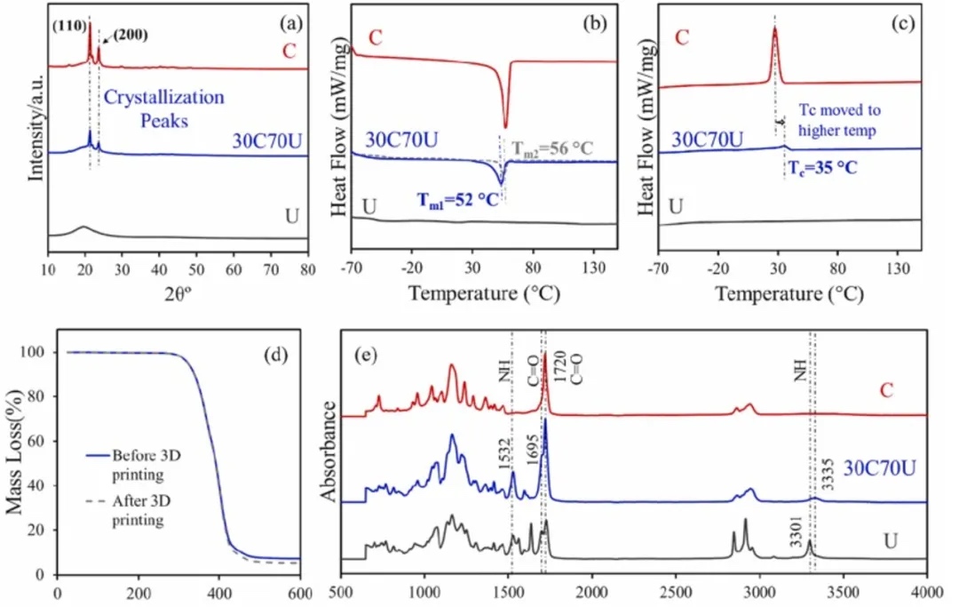 通过XRD、DSC、TGA和傅里叶变换红外(FTIR)光谱技术,表征了开发的UC长丝的结晶度、热性能和混溶性(图2)。在物理交联的形状记忆聚合物中,形状固定率主要由结晶相决定,而形状恢复率则受非晶相的影响。因此,结晶相和非晶相的共存是聚合物材料展现形状记忆特性的关键因素。XRD结果表明,所开发的UC长丝具有半结晶特性。在UC聚合物中,分别在21°和24°处检测到了两个不同的结晶峰,分别对应PCL聚合物中的(110)和(200)晶面的衍射图案。此外,对挤出的长丝进行了DSC分析,温度范围为-70°C至150°C,以研究UC共混物的热性能,包括玻璃化转变、熔融温度和结晶行为。TGA分析结果表明,所开发的长丝在300°C以下的温度下稳定,不发生热降解,这意味着该长丝在低于300°C的打印温度下可以可靠使用,不会发生降解或分解。