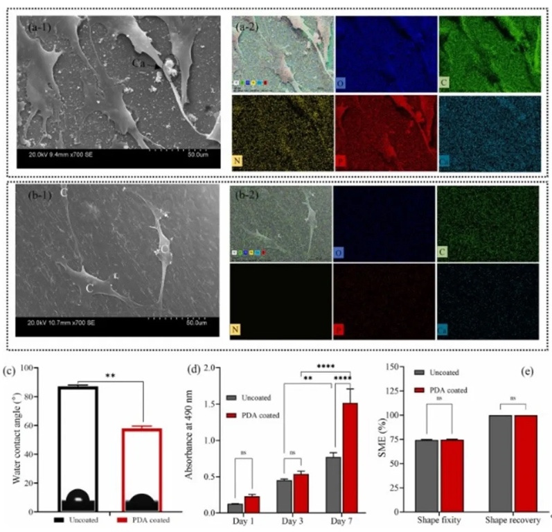 研究探讨了聚多巴胺(PDA)涂层对3D打印UC支架润湿性和细胞相容性的影响。PDA涂层显著提高了支架的亲水性。SEM结果显示,PDA涂层支架上的MG-63细胞表现出更好的扩散性。MTS测定结果表明,PDA涂层支架显著增强了细胞增殖,且PDA涂层支架上形成的钙化结节数量高于未涂层支架,表明其有利于成骨细胞分化。此外,EDS元素映射显示,PDA涂层支架表面成功形成了CaP生物矿化层,且元素密度更高。形状记忆测试证实,PDA涂层不会损害支架的形状记忆特性。因此,PDA涂层支架结合了形状记忆功能和增强的生物活性,为骨组织工程提供了有利的环境。
