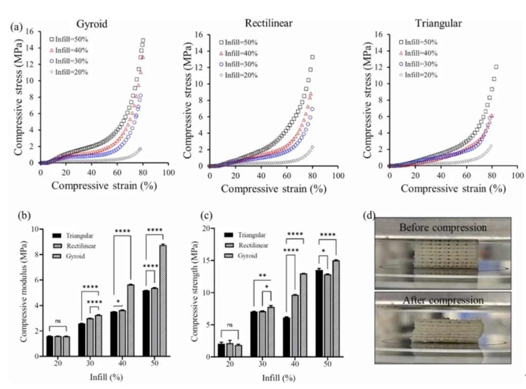 支架的机械强度对于支持组织生长和再生至关重要,FDM打印过程中使用的细丝成分、填充图案和填充密度对支架的机械性能有显著影响。所有UC支架的主要失效机制是屈曲,归因于高比例的TPU,TPU作为高弹性材料,在压缩力作用下发生显著变形,导致屈曲而非脆性断裂(图5)。XRD结果表明,UC长丝具有半结晶结构,PCL和TPU相融合,降低了整体结晶度并增强了弹性。TPU的高弹性和回弹性使支架能够广泛变形而不发生断裂,表明这种材料适用于骨组织工程应用。在所有支架设计中,较高的填充密度具有更大的弹性,使支架在承受压缩时更加耐压。在不同填充模式的支架,螺旋图案的支架表现出优越的机械性能。