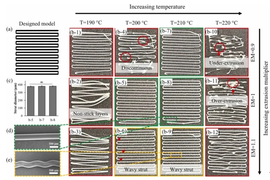 研究通过打印20毫米长的平行单线来评估UC长丝的可打印性,同时变化喷嘴温度和EM值(图3)。实验发现,喷嘴温度对打印结构的可挤出性、形状一致性和稳定性有显著影响。当喷嘴温度为190°C时,不粘层成为主要问题,导致打印质量不佳。提高喷嘴温度可改善材料熔化和流动特性,但过高温度(如220°C)与高EM水平结合时会导致过度挤出和材料聚集。在210°C下打印的样品(EM值为0.9和1)以及在200°C下打印的样品(EM值为1)均表现出良好质量。值得注意的是,这些条件下打印的线条支柱直径无显著差异。此外,200°C和210°C下保持EM=1可获得最佳结果,产生高质量线条。因此,确定210°C为最佳喷嘴温度,EM值为1为最佳挤出倍增器水平。SEM图像进一步证实了这些优化条件下挤出支柱的高质量。