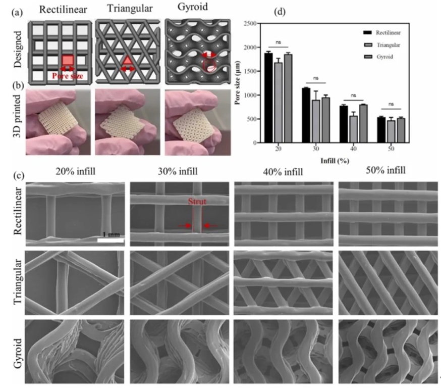 在组织工程中,支架的结构和构造对确定其功能、机械性能及医疗保健应用至关重要。使用 SEM 技术检查支架的微观结构,包括孔径、形状、分布和互连性(图4)。SEM图像展示了直线、三角形和螺旋状设计的多孔结构,且所有支架均表现出均匀且互连的孔分布及出色的结构完整性。随着填充百分比的增加,FDM打印支架的孔径减小,结构更致密。相反,低填充百分比导致结构不太致密,孔径较大。然而,使用不同模式但填充密度相同的支架孔径无显著差异。