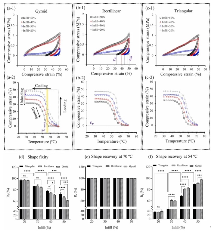 该研究开发了由70% TPU和30% PCL制成的半结晶形状记忆长丝,用于FDM 4D打印具有可调结构、机械性能和形状记忆性能的多孔支架。研究评估了FDM打印参数对支架形态、机械性能和形状记忆性能的影响。SEM成像显示支架具有均匀的孔分布,且填充密度大于30%的支架适用于骨再生。力学测试表明,螺旋状图案的支架表现出最高的力学性能。所有支架的最大抗压强度与天然松质骨相当,范围为1.73到14.93 MPa。热机械循环测试表明,填充图案和密度对形状记忆性能有重要影响,螺旋、直线和三角形图案在52°C的转变温度下分别具有98%、91.1%和89.5%的形状恢复率。聚多巴胺涂层未影响形状记忆性能,但提高了支架的亲水性和细胞增殖。总体而言,该研究为设计可调机械强度多孔形状记忆支架提供了新方向,形状记忆性能在骨缺损再生治疗中具有潜在的应用。