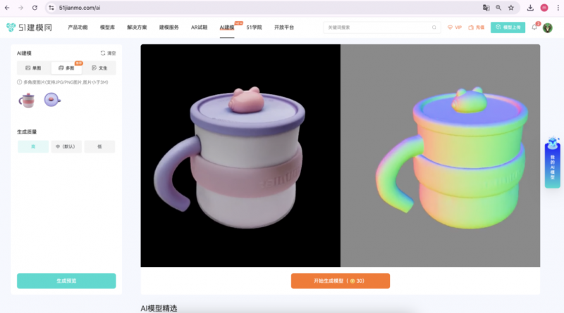 登陆51建模网(www.51jianmo.com),点击菜单栏的「AI建模」,即可体验该功能。优先推荐利用「多图」,利用物品的多角度照片来生成3D模型,生成效果更精准。