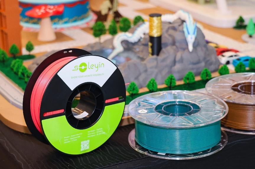 在耗材方面,创想生态推出Soleyin线材,以190-220°C通用打印温度适配所有机型,无需参数调整即可实现PLA、ABS、PETG等多场景应用。ColorMax、FlexPro、UltraCore三大系列支持渐变色、高速打印与环保特性,让“一款耗材搞定所有打印”成为现实。