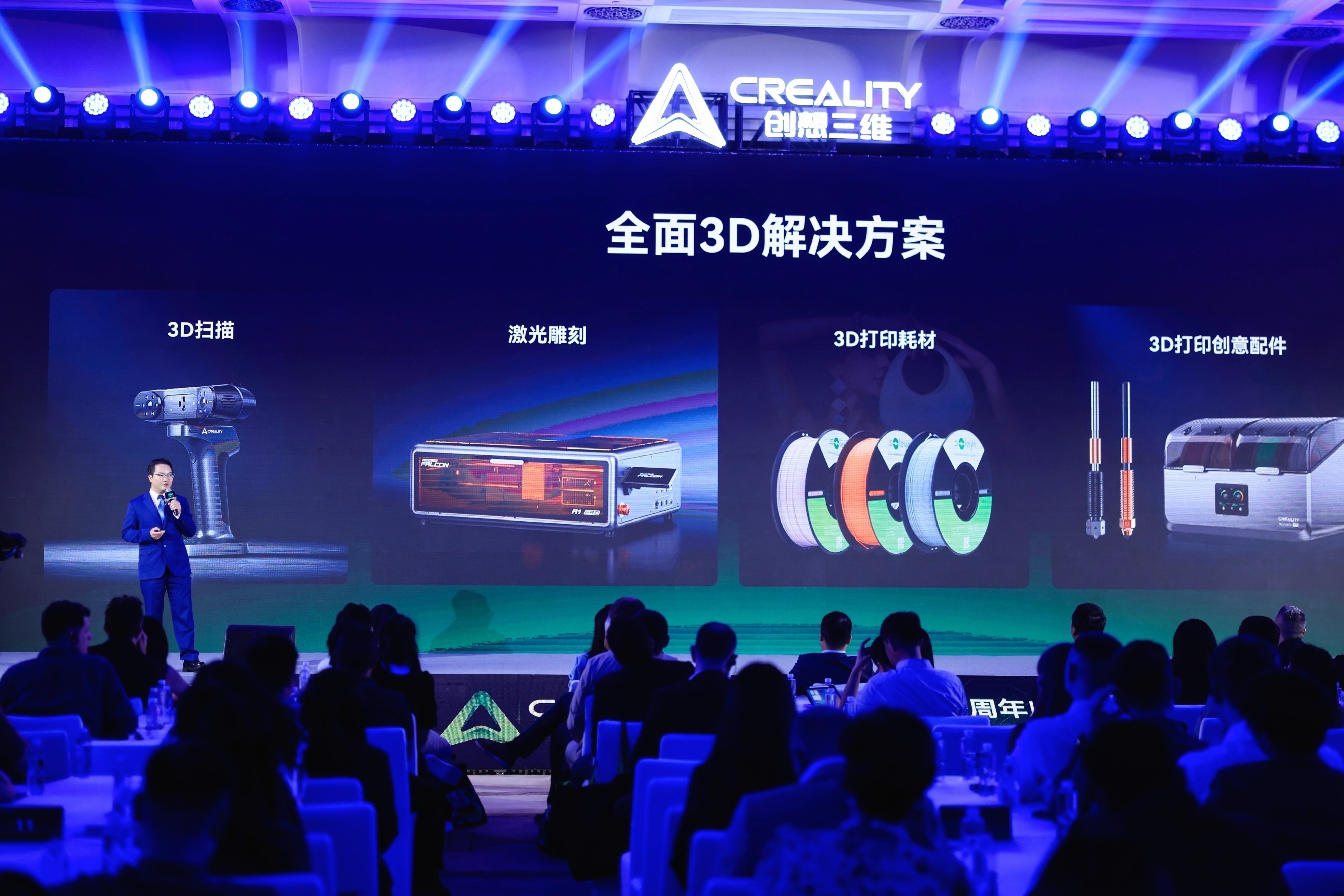 同时,创想三维品牌迎来焕新升级,会上发布全新品牌形象IP及定制字体,以动态光效与未来感设计传递“智造未来”理念,彰显技术美学与品牌进化决心。
