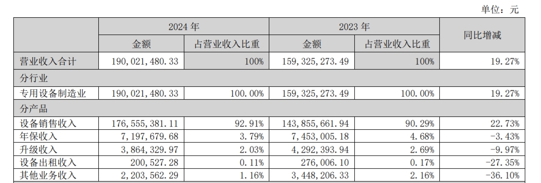 本公司 2024 年度营业收入为 19,002.15 万元,上年同期营业收入为15,932.53 万元,同比上升 19.27%,主要系随着公司 3D 打印产品的研发不断取得突破,3D 打印产品的生产技术不断稳定,2024 年 3D 打印设备销售额较上期增加了约 2,500 万元。本报告期归属于上市公司股东的净利润-303.54 万元,上年同期归属于上市公司股东的净利润-603.58 万元;归属于上市公司股东的扣除非经常性损益的净利润为-260.48 万元,上年同期归属于上市公司股东的扣除非经常性损益的净利润为-669.58 万元。