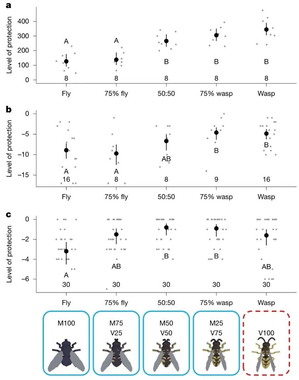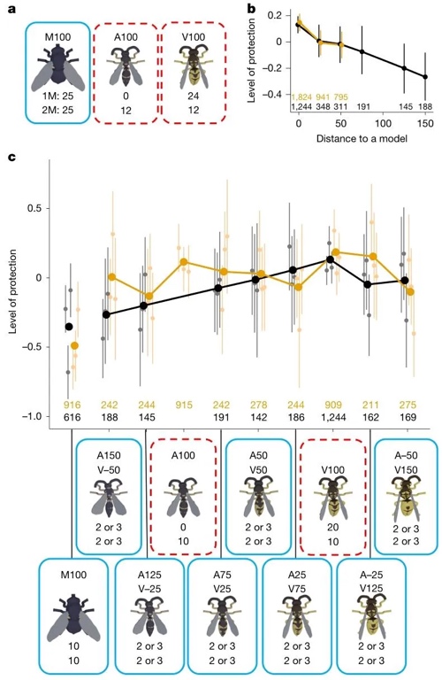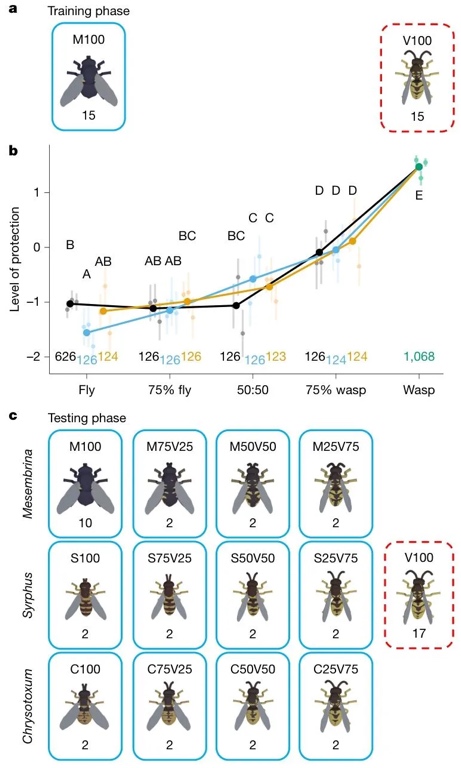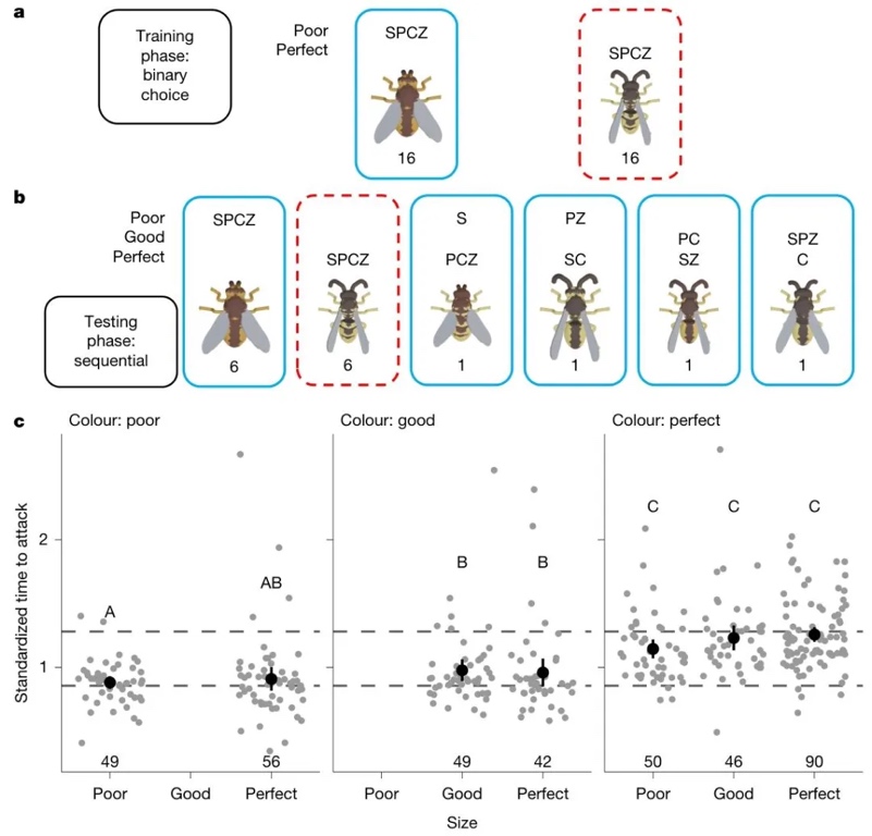 通过实验室行为测试,研究了雏鸡对独立变化的拟态特征(颜色、大小、形状、图案)的敏感度——训练雏鸡区分“苍蝇样特征(差)”和“黄蜂样特征(完美)”,并测量其对中间特征组合的攻击延迟。结果表明,颜色是最关键的辨别特征(颜色越接近黄蜂,攻击延迟越长),其次是大小,而形状和图案对辨别影响较小。