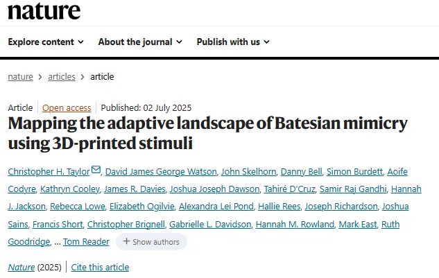 在贝茨氏拟态研究中,不准确拟态的持续存在是进化生物学的关键挑战,现有理论因难以评估现存物种中不存在的表型适应性,导致适应性景观研究受限。诺丁汉大学Christopher H. Taylor教授团队与纽卡斯尔大学、剑桥大学等机构合作,利用3D打印技术,将真实昆虫(苍蝇和黄蜂)的3D图像变形生成中间表型,制作出高分辨率全彩3D打印刺激物,系统测试了鸟类(大山雀、蓝山雀)和无脊椎动物(螳螂、跳蛛、蟹蛛)对这些拟态表型的辨别能力。该研究验证了多模型假设、特征显著性及“观察者视角”假设,为探索拟态进化的适应性景观提供了新方法。相关工作以“Mapping the adaptive landscape of Batesian mimicry using 3D-printed stimuli”为题发表在《Nature》上。