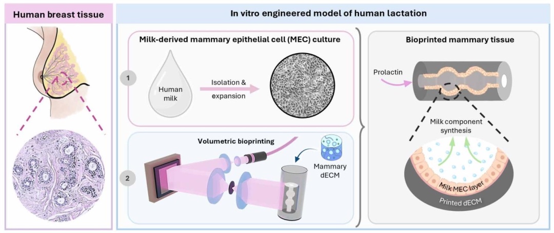 人类母乳对婴儿营养与健康至关重要,但当前对泌乳生物学的理解因依赖哺乳期母亲的相关性研究而受限,且现有体外泌乳模型多基于类器官,存在形成率低、寿命短、物种差异大等问题,传统生物打印也难以精确复制乳腺结构。来自瑞士苏黎世联邦理工学院的Marcy Zenobi-Wong教授团队,利用体积打印技术,将牛乳腺脱细胞外基质(dECM)制备成仿生支架,并结合人乳汁来源的乳腺上皮细胞(MECs),成功构建了支持MECs体外泌乳的三维模型,该模型可分泌β-酪蛋白和乳脂球,为研究泌乳调控因素提供了新平台。相关工作以“Volumetric printed biomimetic scaffolds support in vitro lactation of human milk-derived mammary epithelial cells”为题发表在《Science Advances》上。