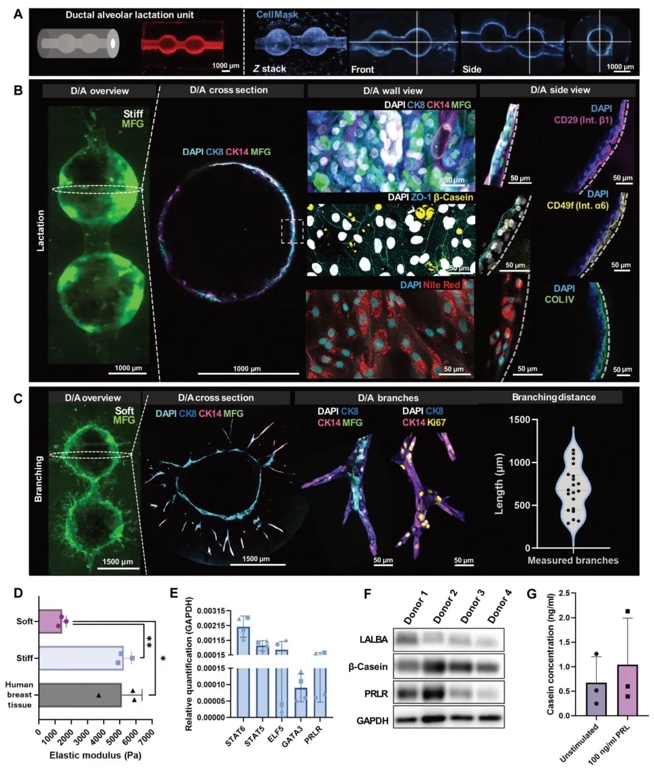 本研究开发了一种基于光响应性乳腺脱细胞外基质(dECM)的体积打印仿生支架,结合人乳汁来源的乳腺上皮细胞(MECs)构建了体外泌乳模型。研究表明,该模型中MECs可在打印的乳腺导管/肺泡(D/A)结构表面形成稳定上皮层,并分泌β-酪蛋白和乳脂球等乳汁成分。模型还能保留泌乳相关基因(如STAT5、PRLR)的表达,且材料刚度可调控细胞分支行为。非传统的乳汁MECs来源为研究提供了新途径,该体积打印平台为探索激素、营养和机械生物学等因素对泌乳的影响提供了可控的体外研究工具,有望推动乳腺组织生物学和泌乳相关研究的发展。