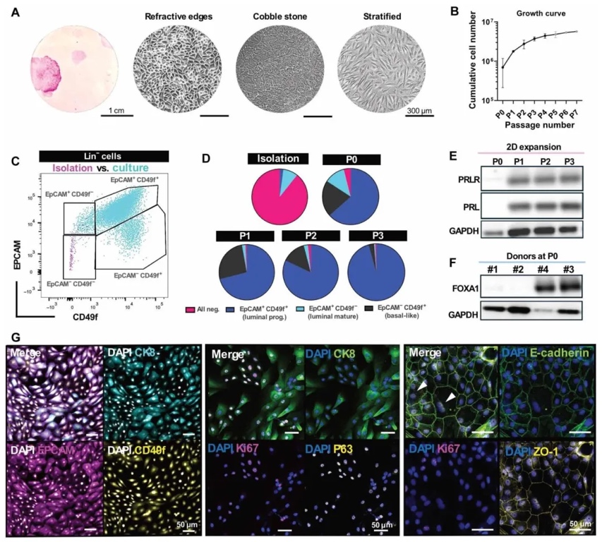 2. 人乳汁来源原代MECs的2D体外培养表型特征图,通过对人乳汁细胞进行分离、扩增,并运用流式细胞术、Western blot及免疫荧光染色等方法,研究了MECs在体外培养过程中的表型及功能变化。结果显示,乳汁MECs可扩增至少三代,保留上皮表型及催乳素受体(PRLR)表达,且能分泌催乳素,具备体外泌乳潜力。
