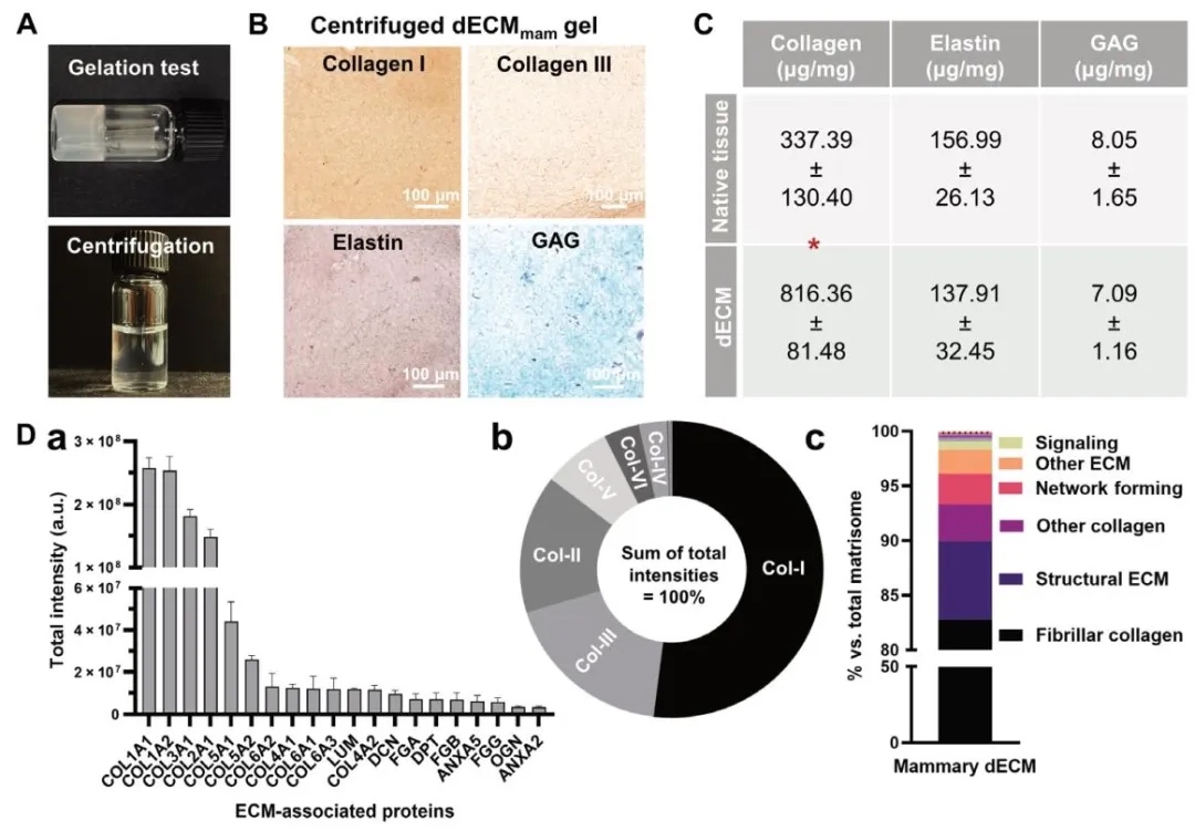 3. 乳腺组织dECM用于光基打印的特性分析图,通过从泌乳期牛乳腺组织提取dECM,进行凝胶测试、组织学染色、蛋白质定量及蛋白质组学分析,研究了dECM的成分与生物活性。结果表明,dECM保留了胶原、弹性蛋白及糖胺聚糖等关键细胞外基质成分,经离心处理后可用于光基打印,为构建仿生支架提供了生物材料。