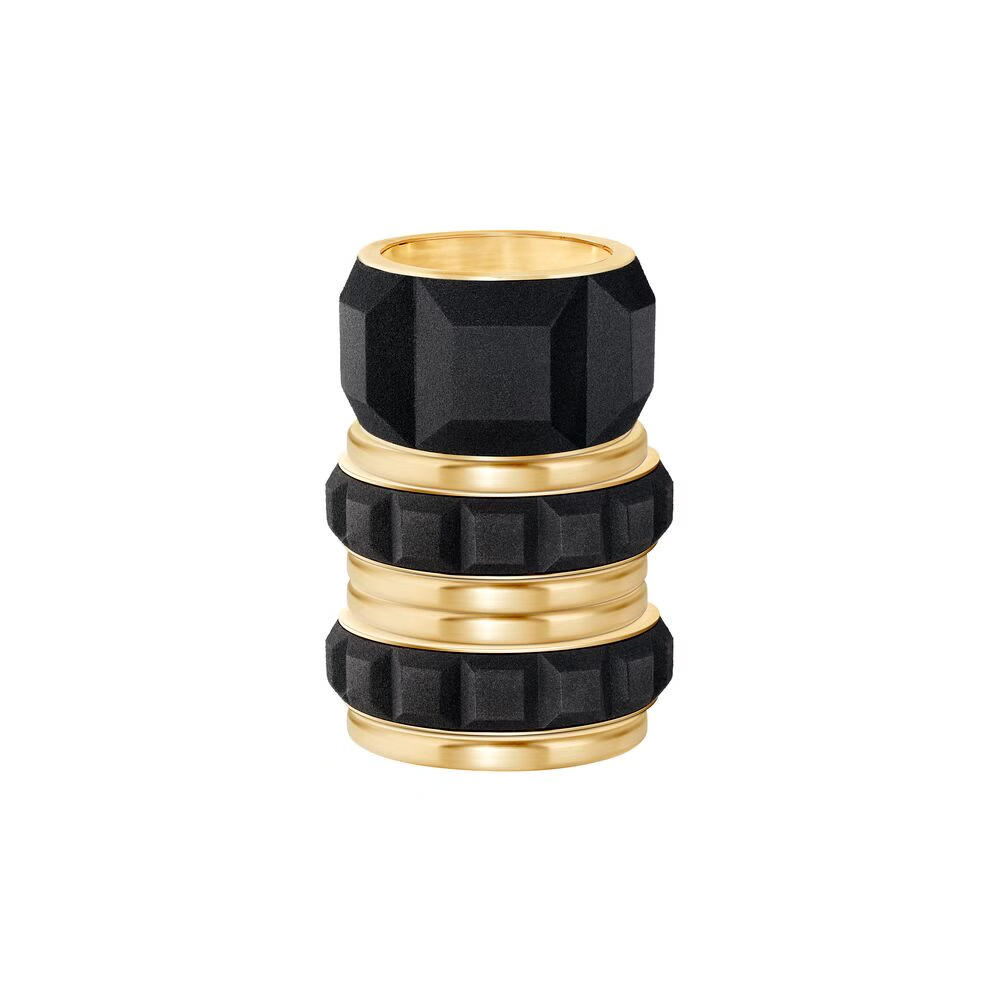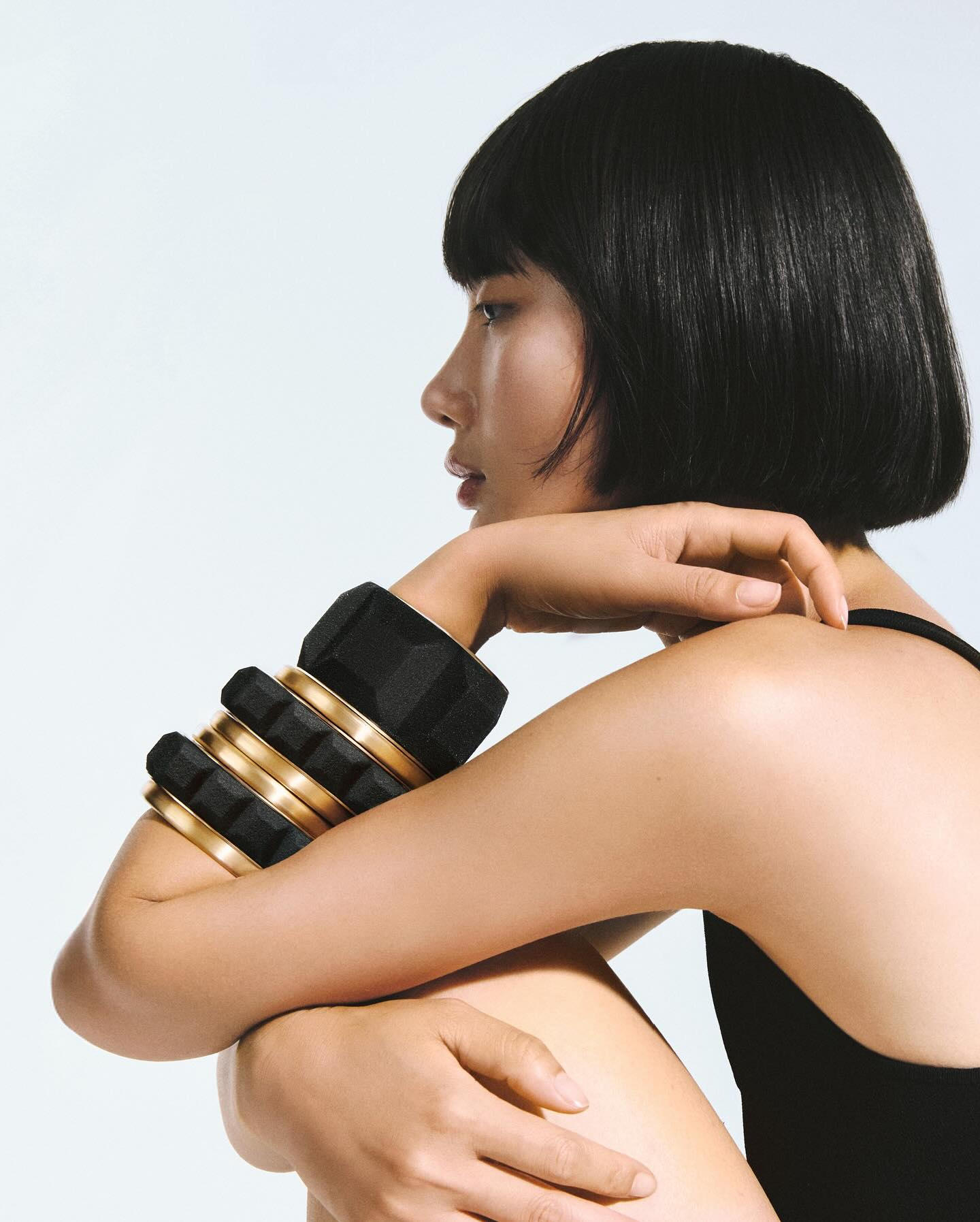在制作过程中,经过处理去除多余粘合剂后,黑砂结构被精确组装于黄金框架上,形成手镯与手环作品。黄金的光滑与光泽,与黑砂的深色、颗粒质感及几何造型形成鲜明对比,展现出珠宝与材料科学的完美融合。