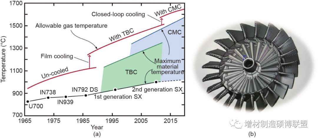 图5. 以涡轮叶片设计为例,3D打印将彻底改变涡轮叶片设计,并改变我们对特殊材料的依赖。(a)材料的潜力有限;(b)一体式叶片转子的冷却结构。TBC:热障涂层;SX:单晶合金;CMC:陶瓷基质复合材料。