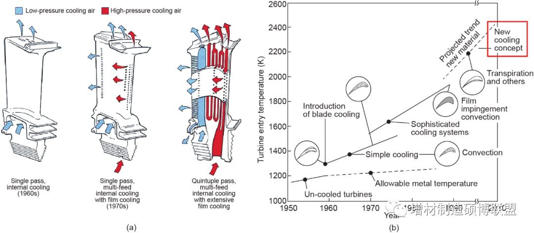 图4. 通过AD / AM改善高压涡轮叶片冷却结构。(a)不同的冷却机制;(b)涡轮叶片冷却结构的发展。