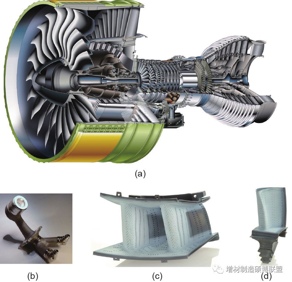 图1. 增材制造在喷气发动机的应用。(a)涡轮风扇喷气发动机;(b)燃料喷嘴;(c)高压涡轮喷嘴;(d)高压涡轮叶片。