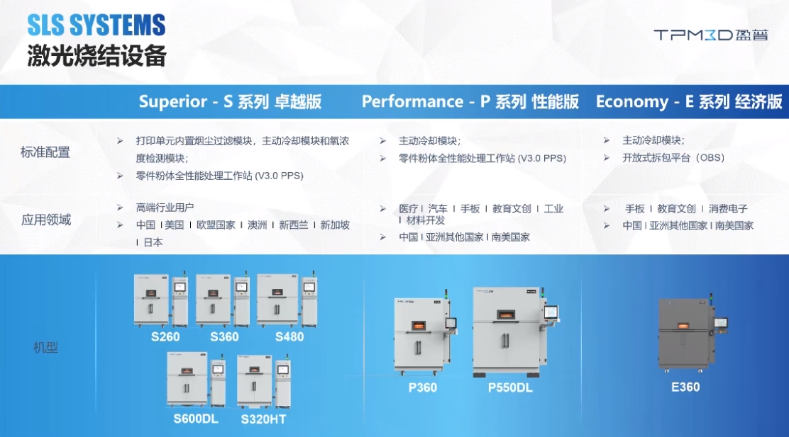 盈普三维最早成立于1999年,主要专注于SLS激光烧结3D打印设备的研发制造和应用服务,曾于2014年获得Stratasys的投资,2019年创始人团队回购股份以TPM3D盈普品牌独立运营,最近几年取得了快速发展。目前在国内拥有五个基地,总部位于上海,在北京、江苏盐城、广东中山、安徽合肥设有服务和制造中心,是国内领先的激光烧结高分子聚合物粉体3D打印解决方案供应商。