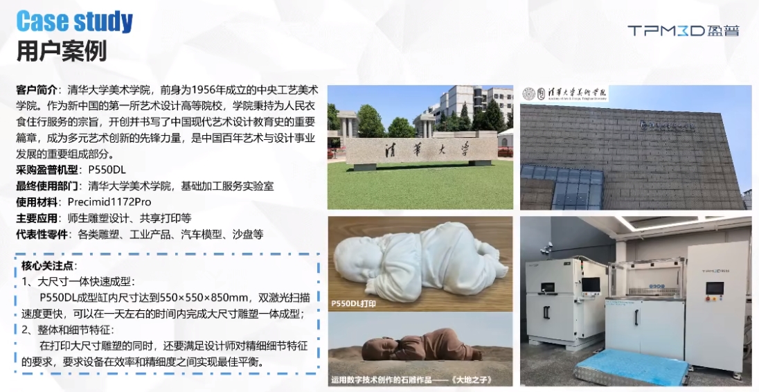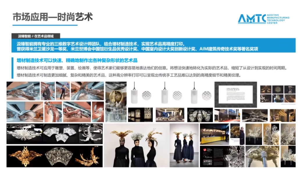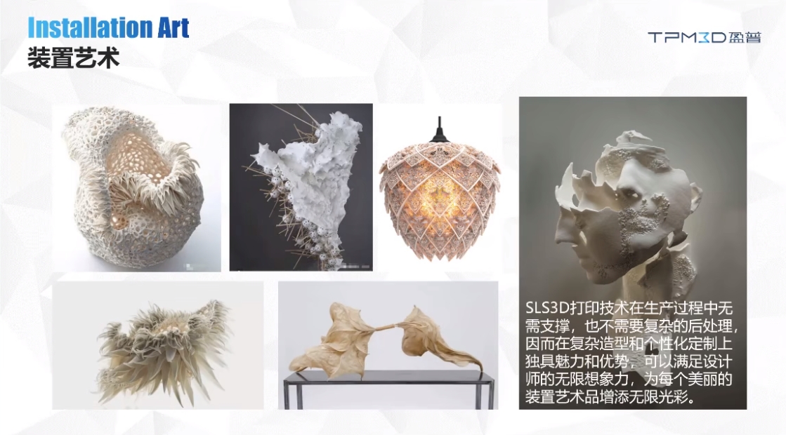 由于SLS 激光烧结技术在3D打印零件的过程中不需要支撑结构,因此在复杂造型和个性化定制上独具魅力和优势。之后,王智毅展示了SLS 3D打印技术在装置艺术、建筑设计、艺术教育、考古学、医疗、雕塑设计、新材料工艺开发等诸多领域的应用案例。