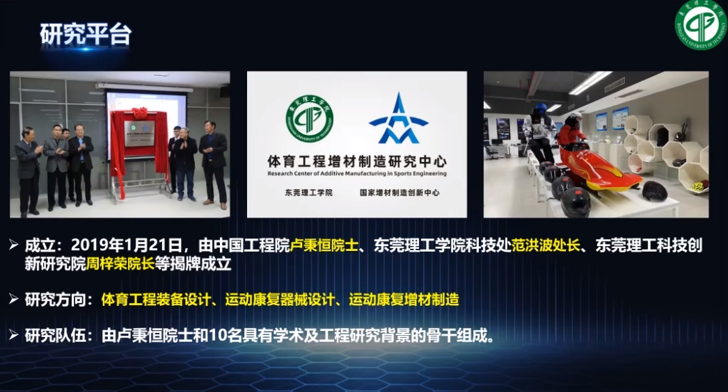 2018年东莞理工学院引进卢秉恒院士团队,共同建设了“体育工程增材制造研究中心”,研究体育工程装备设计、运动康复器械设计、运动康复增材制造等方向,并开始通过3D打印技术来制造体育装备,依托国家重点研发计划“科技冬奥”重点专项,攻坚雪车及周边设备的国产替代。