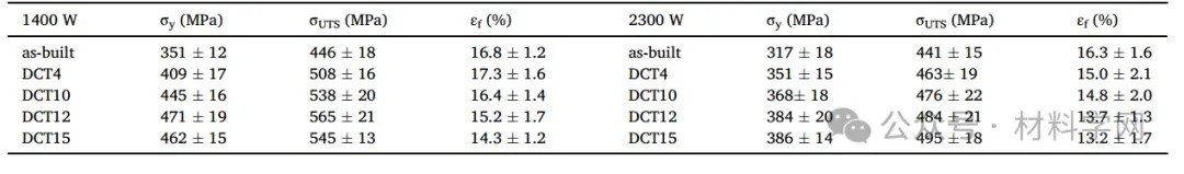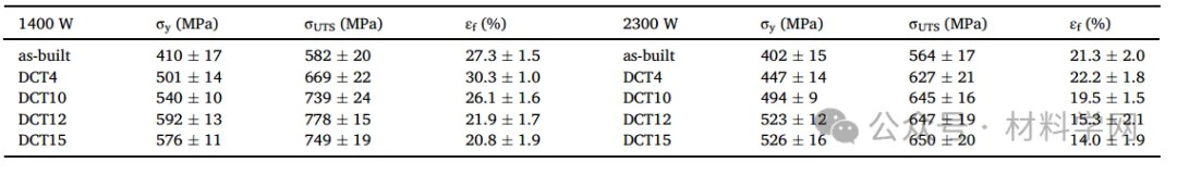 导读:激光金属沉积(LMD)加工的CrMnFeCoNi高熵合金(HEA)的重复深冷浸泡处理(DCT)在不影响延展性的情况下显著提高了其强度。这归因于压缩应力诱导的纳米孪晶形成,这反过来又促进了孪晶诱导的塑性。本文对沿构建和扫描方向的残余应力分布和DCT循环对HEA拉伸性能的影响进行了参数化研究。为此,用5种不同的激光功率 (1100,1400,1700,2000和2300w)制造的构件进行了测试,并考虑了残余应力梯度最高和最低的构件进行进一步的DCT处理。结果表明,当激光功率为1400