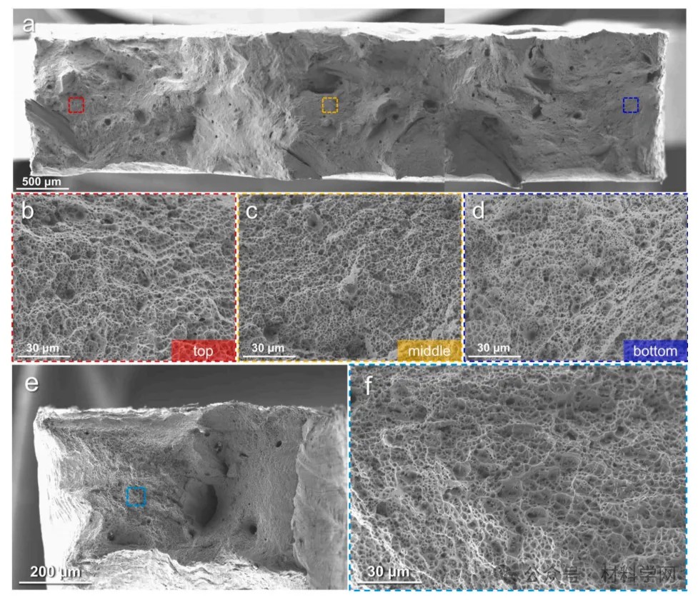 (e)从沿BD加载的1400W-DCT4构建中提取的拉伸测试试样的低倍和高倍SEM断口图。