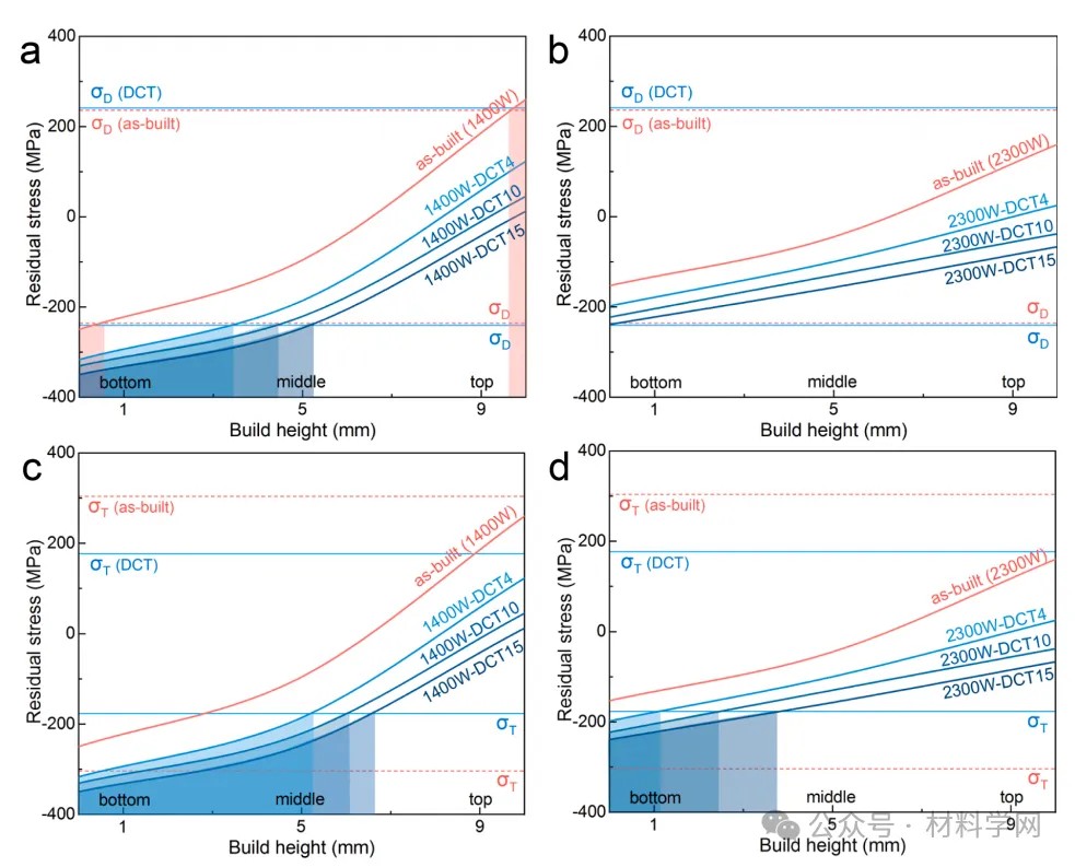 图14在激光功率为(a) 1400w和(b) 2300w的情况下,合金沿构建高度的平均残余应力分布图和位错产生的临界应力σD。