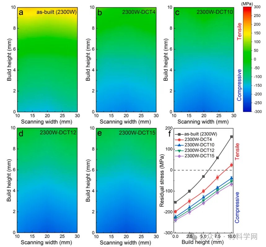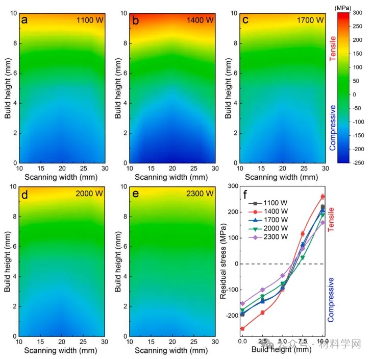 (e) 2300 W的CrMnFeCoNi HEAs在BD × SD平面上的残余应力图及其(f)沿构建高度的平均残余应力分布图。