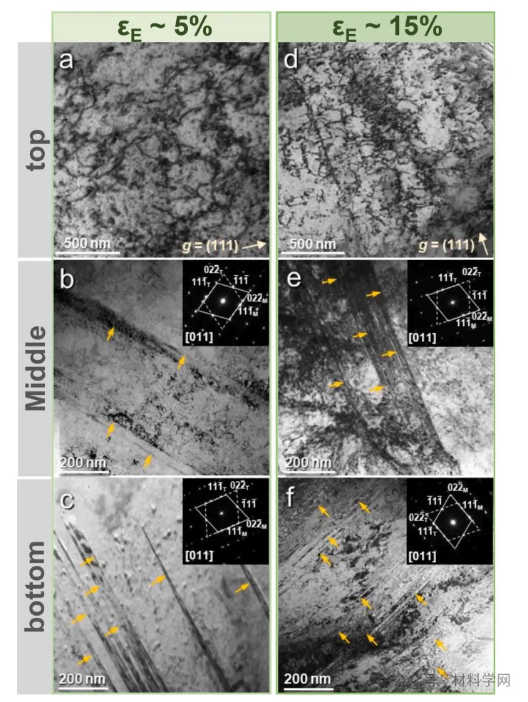 图12在1400 W的激光功率下,在(a)-(c) 0%和(d)-(f) 15%的应变下,沿着BD进行拉伸测试,并在底部、中部和顶部的亮场TEM图像。纳米孪晶用黄色箭头标记。(b)、(c)、(e)和(f)中的插图是沿[011]区域轴的相应SAED图案。