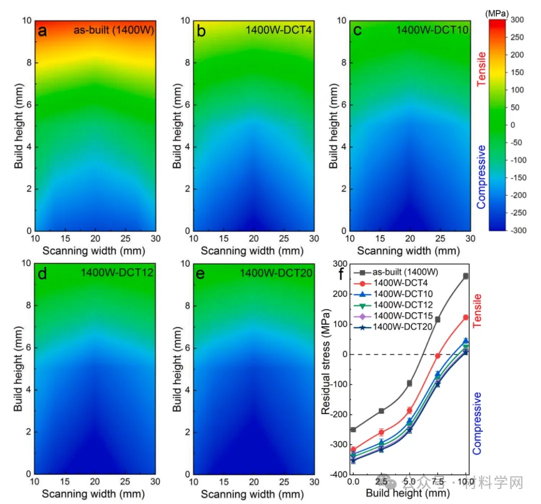 (e) 1400W- dct20各建筑的残余应力分布图及其(f)平均残余应力随建筑高度的变化曲线。