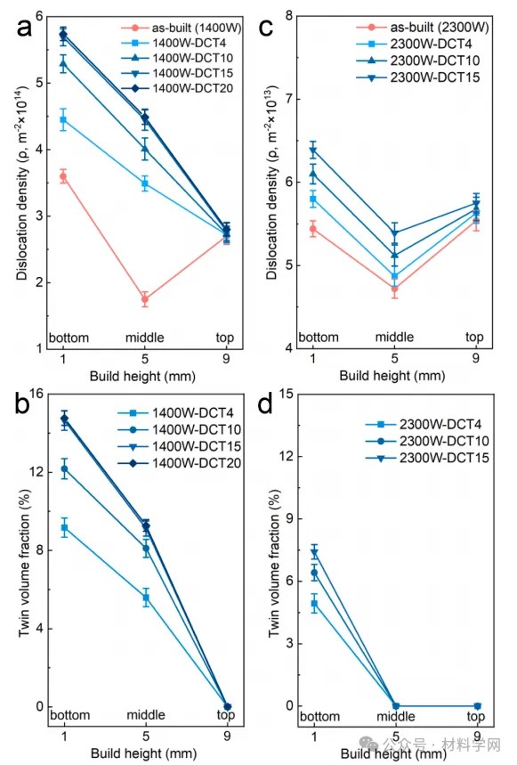 图8在激光功率为(a)-(b) 1400w和(c)-(d) 2300w的情况下,位错密度和孪晶分数沿构建高度的变化。