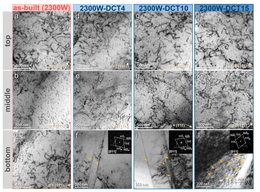 图7 LMD底部、中部和顶部区域的亮场TEM图像(a)-(c)构建(2300W), (d)-(f) 2300W- dct4, (g)-(i) 2300W- dct10, (j)-(l) 2300W- dct15构建。