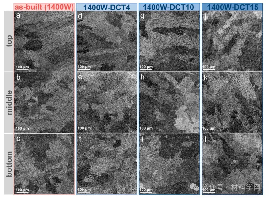 图6 LMD底部、中部和顶部区域的亮场TEM图像(a)-(c)构建(1400W), (d)-(f) 1400W- dct4, (g)-(i) 1400W- dct10, (j)-(l) 1400W- dct15构建。