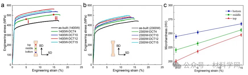 图9用激光功率分别为(a) 1400 W和(b) 2300 W,沿SD方向进行拉伸测试,在建成和DCT处理后,加载轴向SD方向的试件室温拉伸应力-应变响应。插图说明了拉伸试样内的顶部、中间和底部部分。