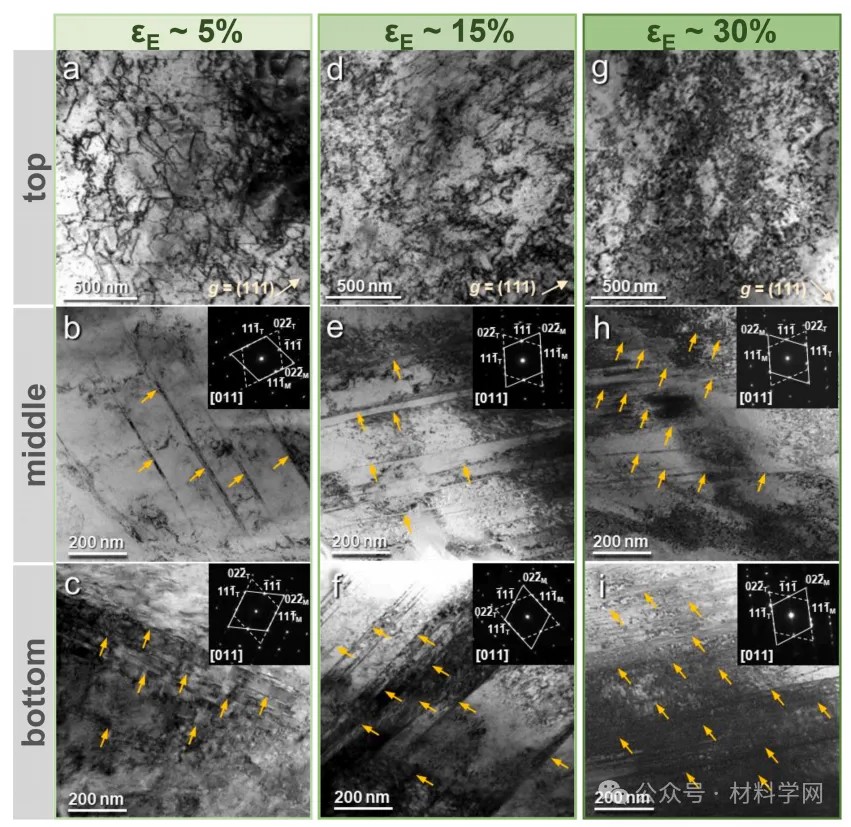 图10 1400W-DCT4构建的底部、中部和顶部的亮场TEM图像沿着SD进行拉伸测试,应变为(a)-(c) 0%, (d)-(f) 15%, (g)-(i) 30%。