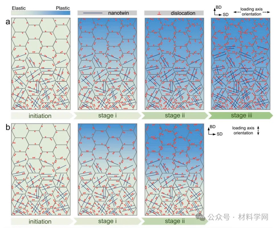 图15梯度结构内部的异步变形过程示意图。(a)加载轴向SD方向。(b)向BD方向的加载轴。位错用红色符号⊥表示,纳米孪晶用斜线表示。