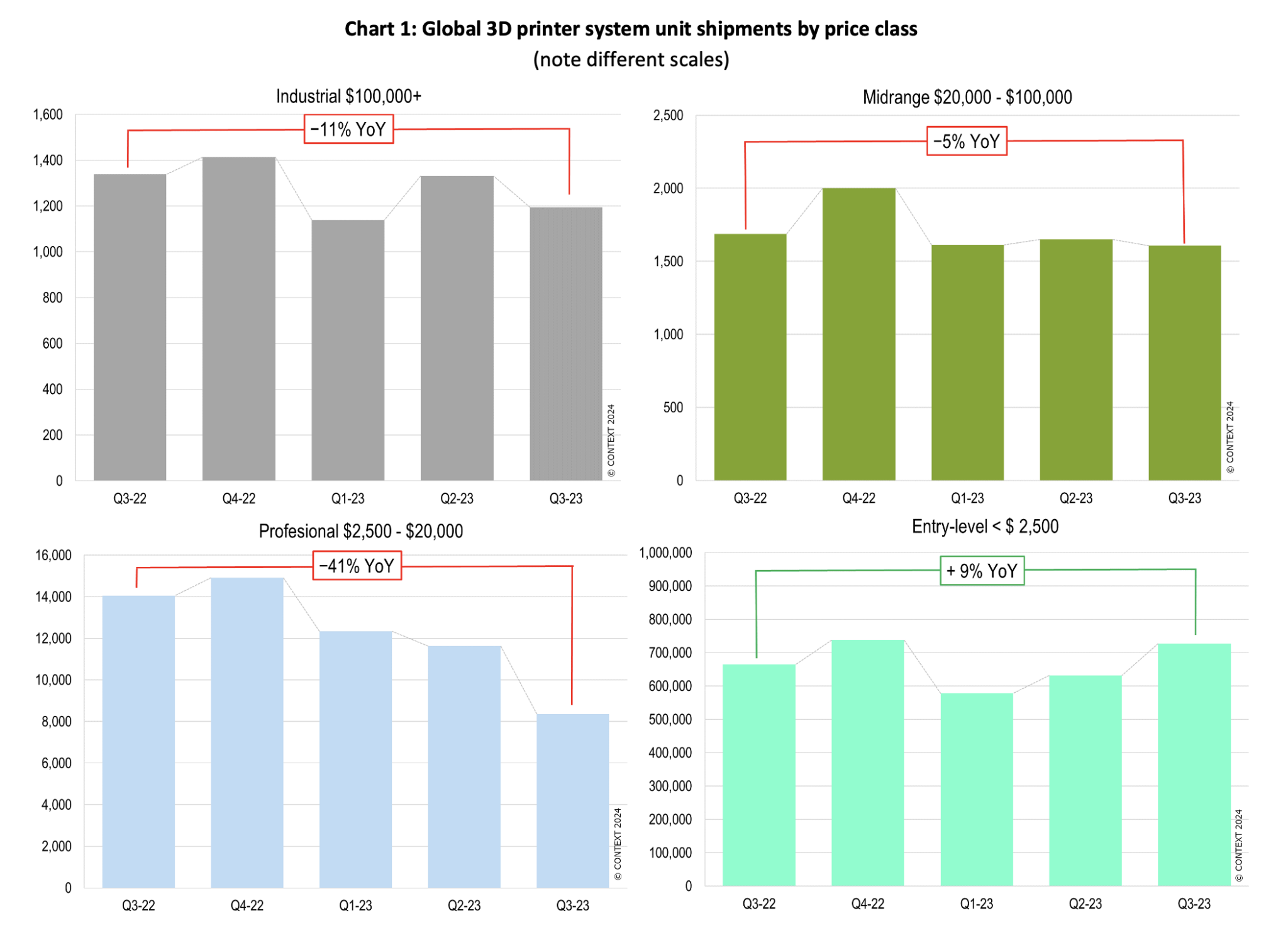 CONTEXT是一家市场情报和分析公司,每季度跟踪全球 3D 打印机出货量。该公司发现入门级类别(包括售价 2,500 美元及以下的打印机)的增长最为稳定,2023 年第三季度的出货量比上年增长了 9%。