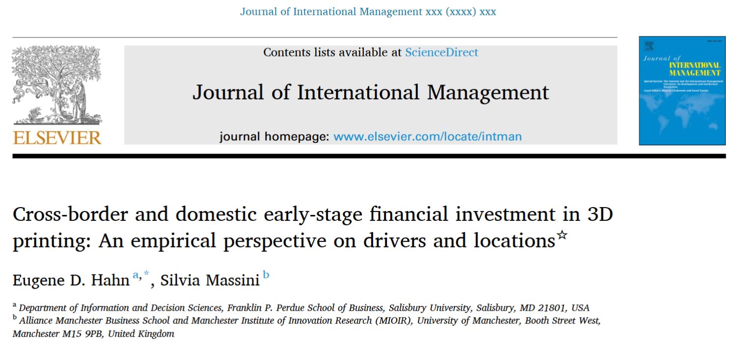 2024年7月,来自索尔兹伯里大学和曼彻斯特大学的研究学者,对3D打印技术投资融资情况进行研究,推动人们理解3D打印技术在全球范围内的投资模式和创新生态系统的发展。他们的研究已经发表在Journal of International Management期刊上,题目为Cross-border and domestic early-stage financial investment in 3D printing: An empirical perspective on drivers and locations.