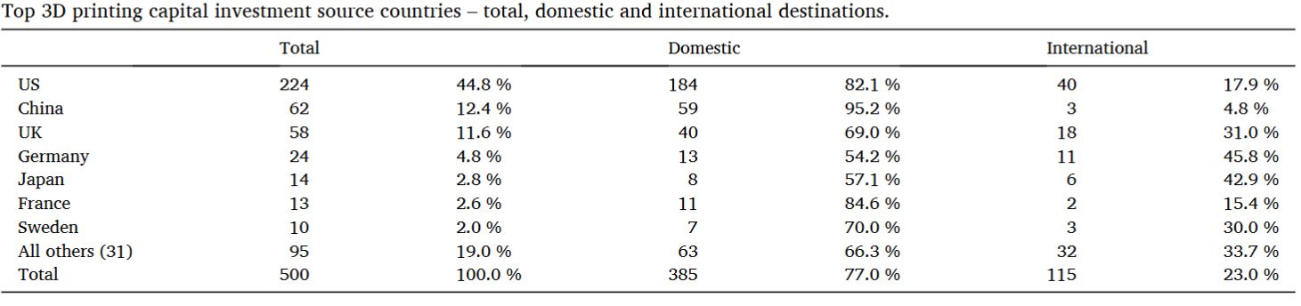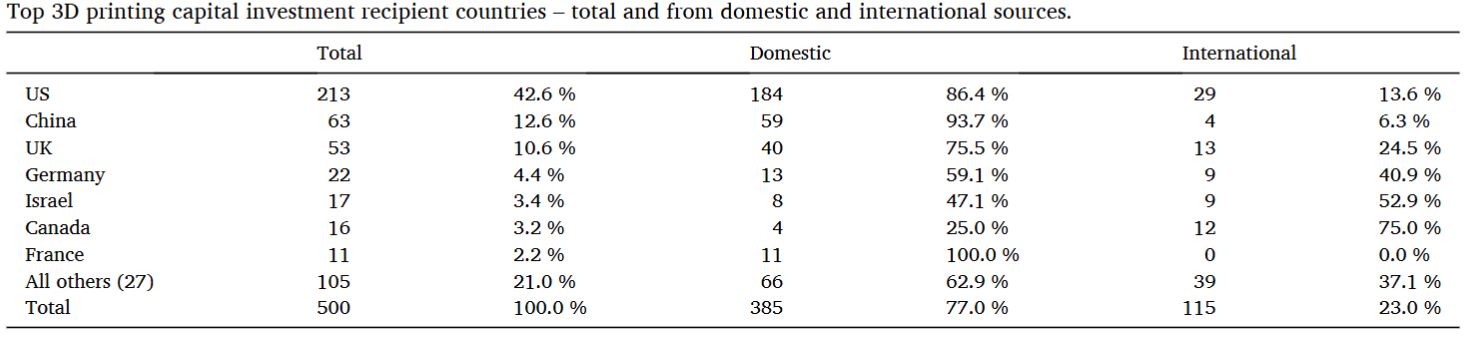学术研究:3D打印技术公司的投资主要集中在哪些国家和地区?
