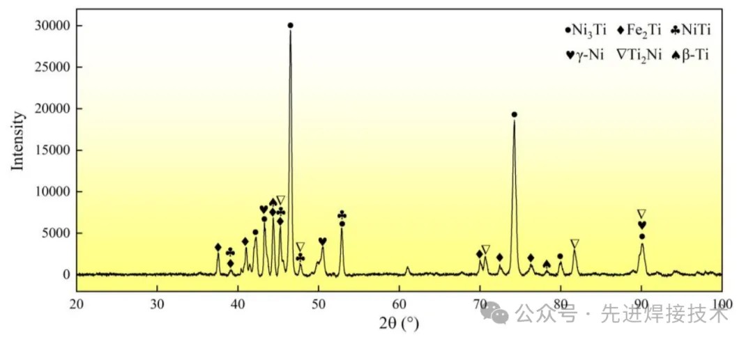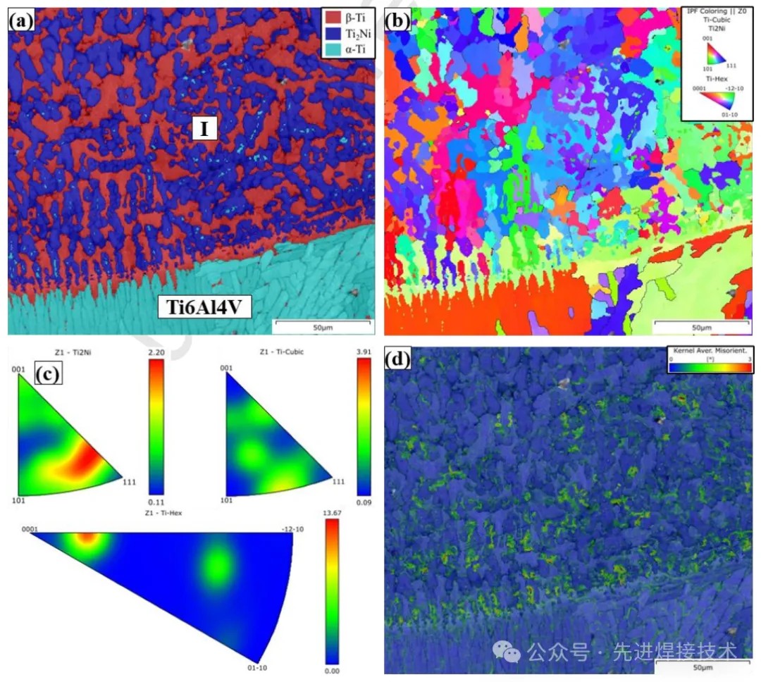 根据金属间化合物相类型的不同,将梯度界面划分为三个区域。随着Ti元素的减少和Ni元素的增加,Ti2Ni、TiNi和Ni3Ti依次形成。Ⅰ区的主要相为片状Ti2Ni,含有少量β-Ti和α-Ti。主相由液相直接形成或由L → β-Ti + Ti2Ni共晶反应形成。与Ti6Al4V相比,区域I的织构强度明显减弱,晶粒各向异性增强。同时,由于不同相之间的韧性差异和热应力的存在,导致了形变失配,使得Ti6Al4V区与Ⅰ区的界面处以及部分Ti2Ni相中的KAM值较高。