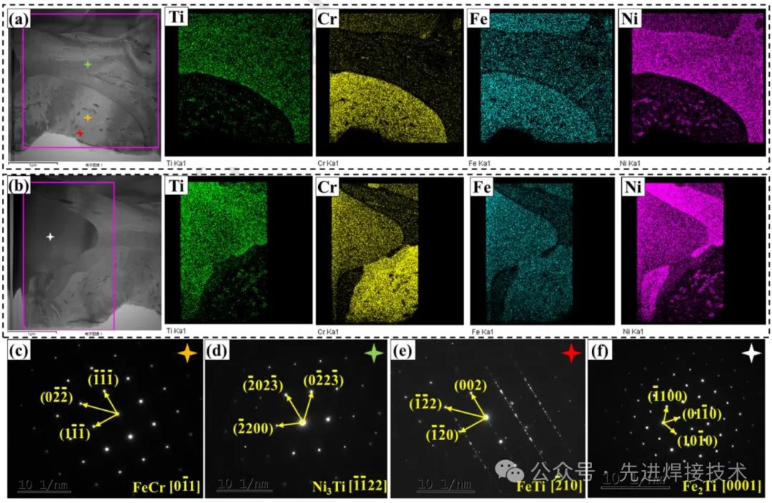 图 5过渡界面Ⅲ区的TEM分析结果 (a-b)Ⅲ区不同位置的显微组织和元素分析结果;(c-f)相应位置的选区电子衍射