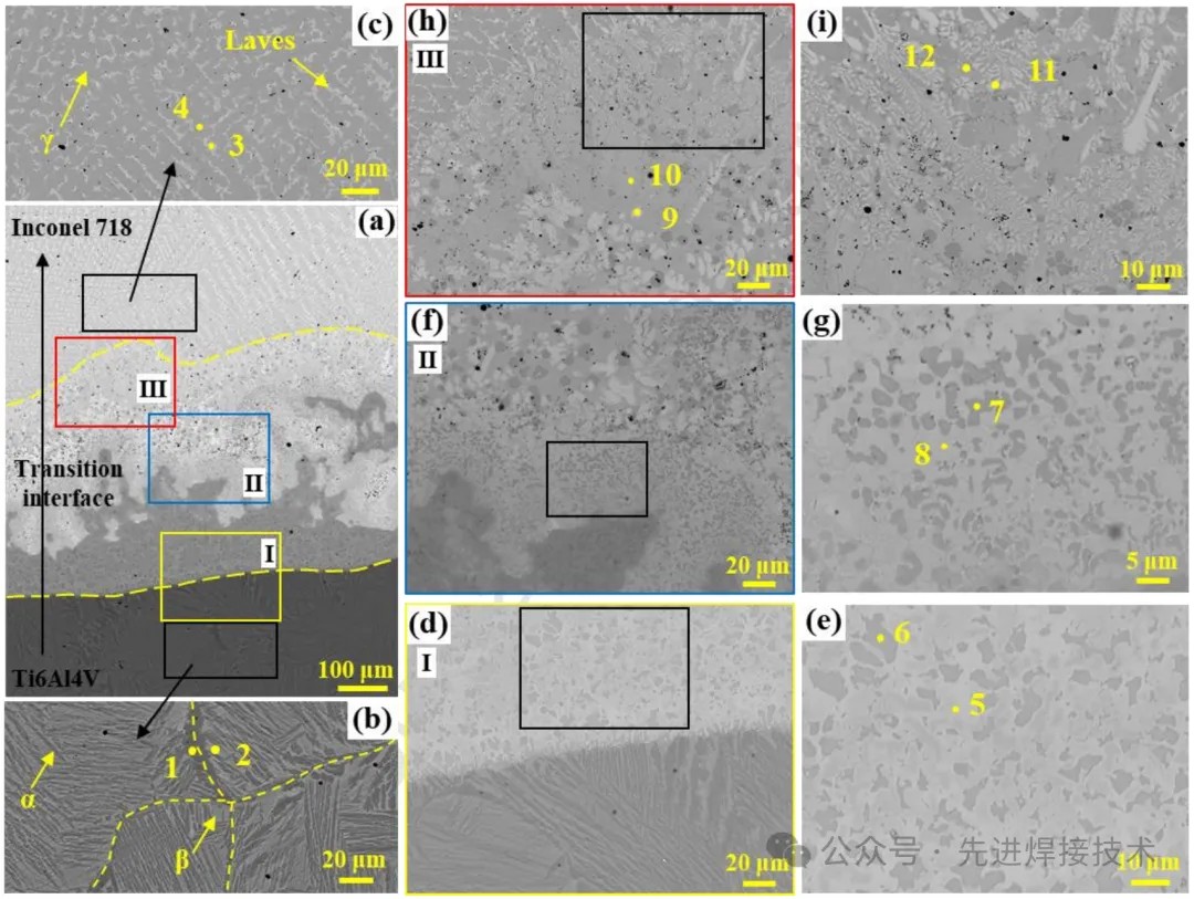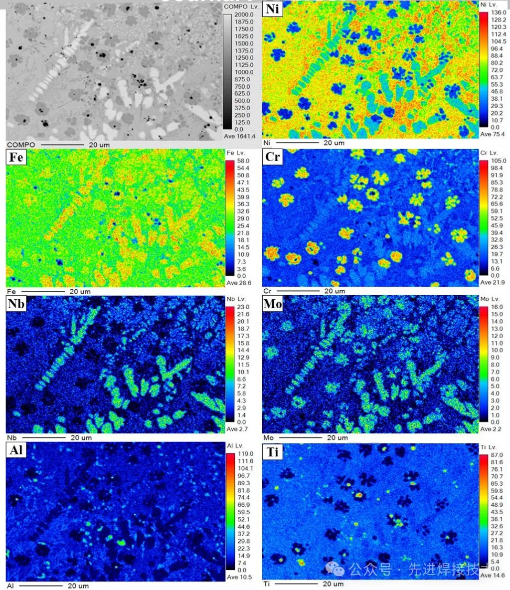 在Marangoni效应和材料密度差的作用下,Inconel 718和Ti6Al4V在界面处相互交错,梯度界面不均匀。Ti6Al4V中含有α-Ti和β-Ti相,在梯度界面附近呈细片状,并从Ti6Al4V向过渡界面延伸。Inconel 718含有γ和Laves相。Laves相的分布取决于基体γ的枝晶形态。Inconel 718合金的相变顺序一般为L → L + γ → L + Laves + γ。首先,形成γ相。随着γ枝晶的增多,液相中Mo、Nb、Ti元素的浓度逐渐增大。当达到一定浓度时,发生L → Laves + γ反应。